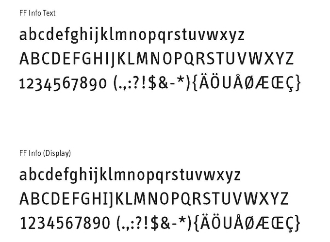 Die FF-Info ist eine Groteskschrift in einer zeitgemäßen und charakteristischen Ausformulierung. Sie ist schmallaufend, aber dennoch gut lesbar und weist im Detail feine Formen auf. Die FF-Info gibt es u.a. in den Schriftfamilien FF-Info-Text und FF-Info-Display.