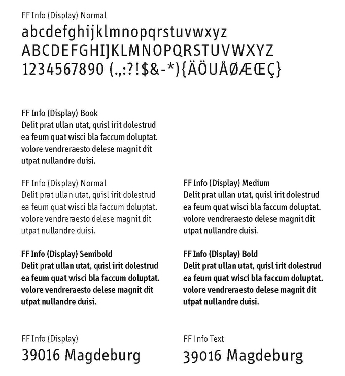 Die Hausschrift der Universität Magdeburg ist die FF-Info, die in zahlreichen Schriftschnitten zur Verfügung steht und sich somit gut als Corporate-Design-Schrift eignet, da sie viele Anwendungsfälle abdeckt. Die FF-Info-Text eignet sich ideal für Buchtexte, Redaktions- und Verlagsarbeiten. Sie bietet erweiterte typografische Unterstützung mit Funktionen wie Ligaturen, Kapitälchen, Alternativzeichen, Groß- und Kleinschreibung, Brüche sowie hoch- und tiefgestellte Zeichen und ist für gedruckte Produkte eine sehr gute Lösung.