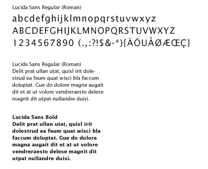 Die Lucida Sans ist eine Groteskschrift in einer zeitgemäßen Ausformulierung. Sie läuft nicht so schmal wie die FF Info und eignet sich gleichermaßen für Bildschirm wie Laserdrucker. Ihr größter Vorteil aber ist, ihre standardmäßige Verfügbarkeit auf nahezu jedem System.